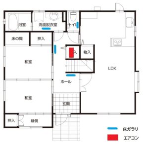 「ユカコン」の設置には、エアコンを設置するスペースが必要です。図の例のように、物入れの下半分の場所を確保して、その扉にガラリを設けて空気の流れを作る必要があります。1Fの和室が寝室だとすると「ユカコン」の設置により、廊下・洗面脱衣室・トイレの温度のバリアフリー化が実現します。